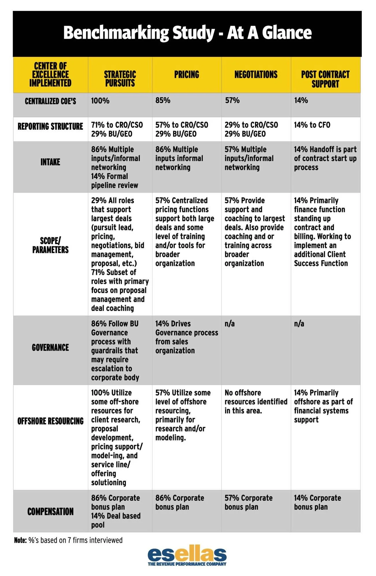 #1 Centralization of Key Strategic Commercial Functions is imperative to increase sales performance for large, global professional services firms. Centralized Centers of Excellence are a proven way to drive organizational alignment and build expertise in any environment. 100% of the organizations utilizing CoEs saw higher win rates and improved responsiveness.