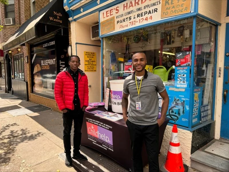 Turning the corner, I saw two young men standing in front of the hardware store on 20th and Spruce. Next to them was a folding table with a pile of backpacks on it and a draping sign reading “ChildHelp.org”.
